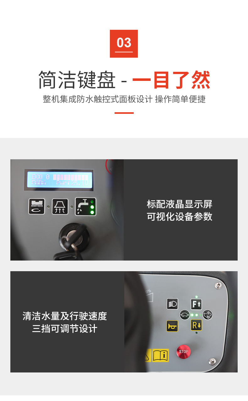 ● 刷盤、水刮架一鍵電動升降,倒車水刮架自動抬升