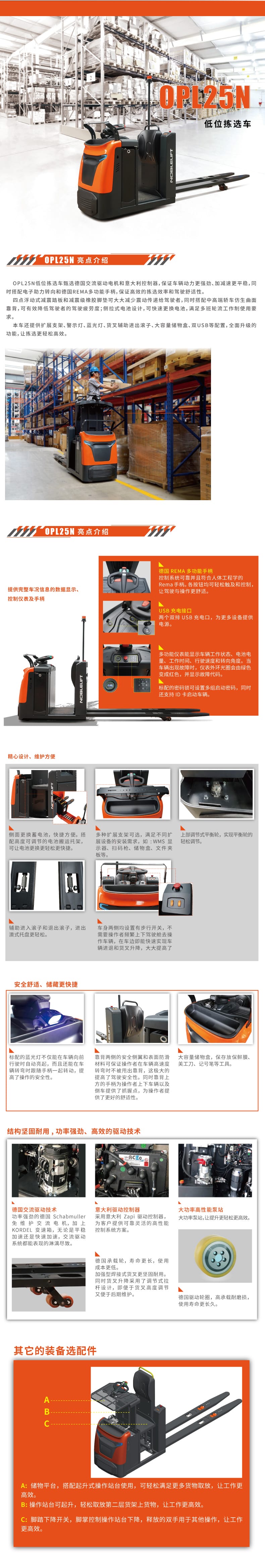 ● OPL25N低位揀選車甄選德國交流驅(qū)動電機(jī)和意大利控制器,保證車輛動力更強(qiáng)勁、加減速更平穩(wěn),同