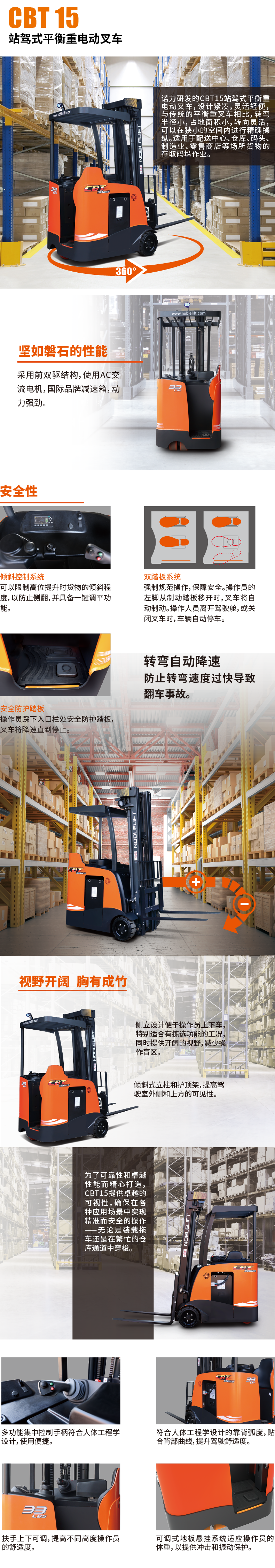 諾力站駕式平衡重電動(dòng)叉車(chē)CBT15,設(shè)計(jì)緊湊,靈活輕便,與傳統(tǒng)的平衡重叉車(chē)相比,轉(zhuǎn)彎半徑小,占地面積小,轉(zhuǎn)向靈活,可以在狹小的空間內(nèi)進(jìn)行操縱。適用于配送中心、倉(cāng)庫(kù)、碼頭、制造業(yè)、零售商店等場(chǎng)所貨物的存取碼垛作業(yè)。
